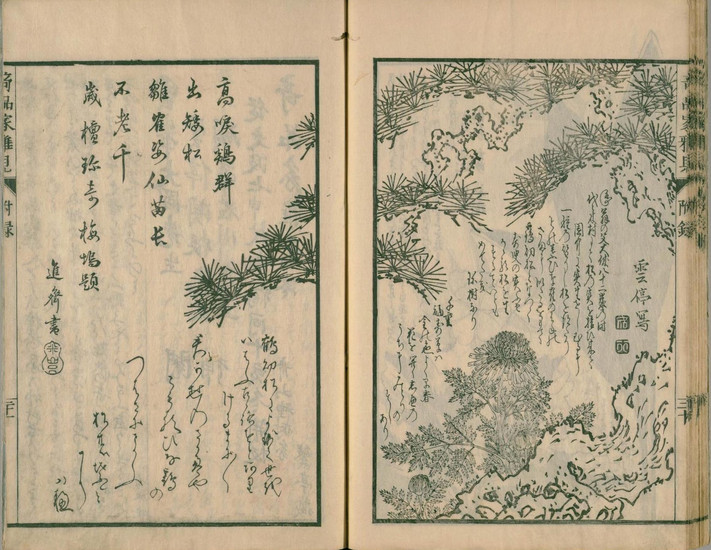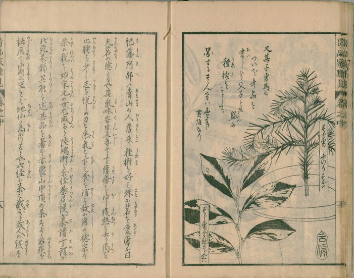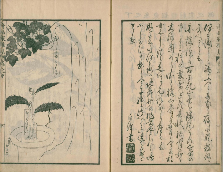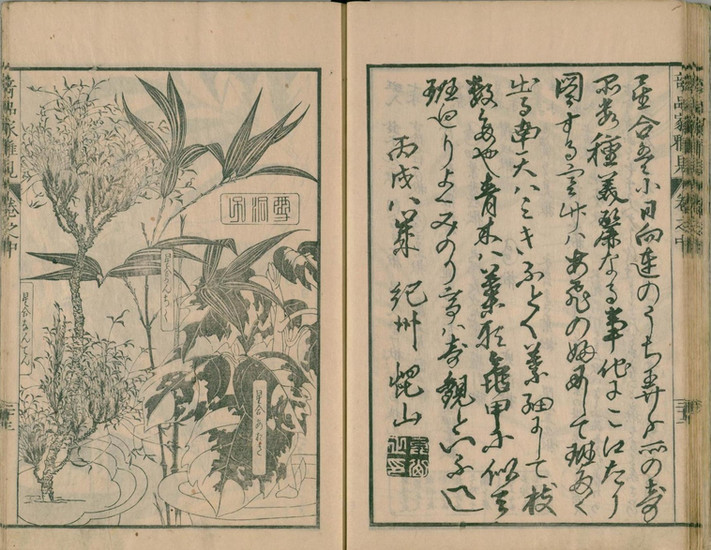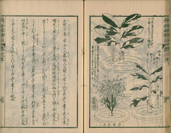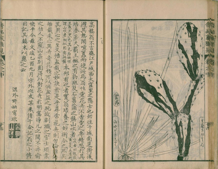 『草木奇品家雅見』は、江戸時代後期にあたる文政10年(1827)に刊行された、形状が特異な草木を専門に扱った図譜です。その別名も『奇品家雅見』と称され、当時の園芸愛好家たちの間で流行した「奇品好み」を象徴する一冊として知られています。