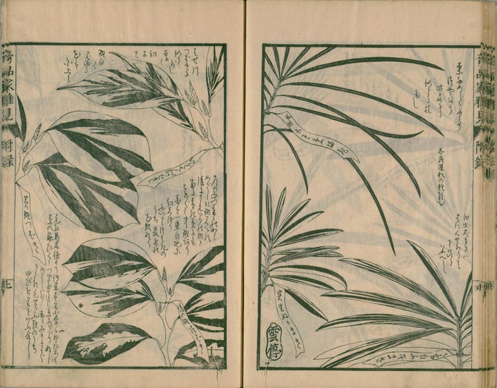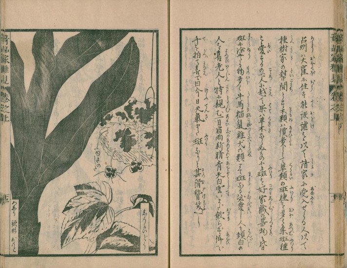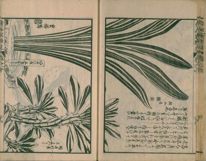 この園芸ブームを背景に、植物の生態や栽培法を記録した図鑑や学術書、園芸書が数多く刊行されました。これらの出版物は、当時の高い版画技術によって精緻な図版が手彩色で施され、学術的価値だけでなく芸術的価値も高く評価されています。『草木奇品家雅見』もその一つであり、当時の人々の知的好奇心と実学志向を象徴する作品と言えるでしょう。また、浮世絵にも花見や植木売り、花を愛でる人々が頻繁に描かれ、園芸が生活に深く溶け込んでいた様子が伺えます。