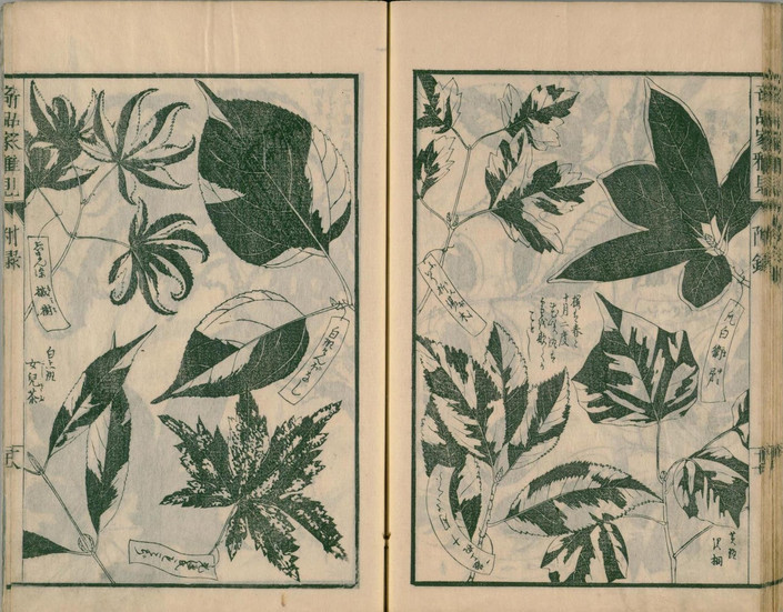 水野忠暁は、若年より園芸を好み、植木屋が教えを乞うほど卓越した草木の栽培技術を持っていたと伝えられています。彼自身も、斑入り植物を中心とした奇品植物図集『草木錦葉集』を文政12年(1829)に刊行しており、その専門性の高さが伺えます。