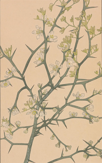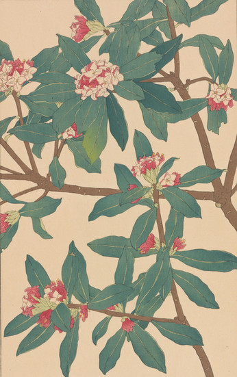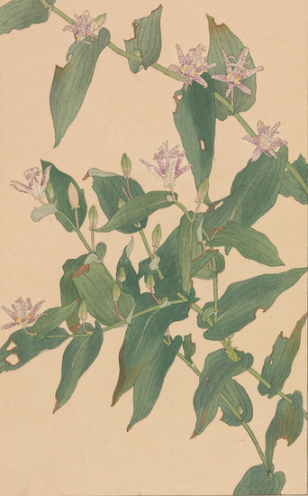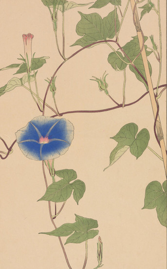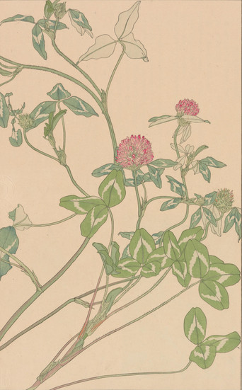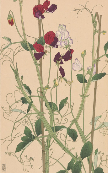 『非水百花譜』第一輯には、中国原産で古くから日本に伝わった「しゃが(著莪)」、明治初期に日本に渡来した「おほまつよひぐさ(大待宵草)」、そして「ぼけ(木瓜)」、「すひかずら(忍冬)」、イタリア・シチリア島原産の一年草である「じやかうれんりそう(麝香連理草、スイートピー)」などが収録されています。この画譜が600名の予約販売制をとっていたという事実は 、当時の日本に、高価な美術書や図案集を購読するだけの経済力と文化的な関心を持つ層が一定数存在したことを示しています。これは、非水の知名度(三越での活躍など)と、大正期における新しいライフスタイルや美意識への需要の高まりが背景にあったと考えられ、日本の近代グラフィックデザインが単なる商業活動に留まらず、文化的なムーブメントとして受け入れられつつあった状況を裏付けるものです。