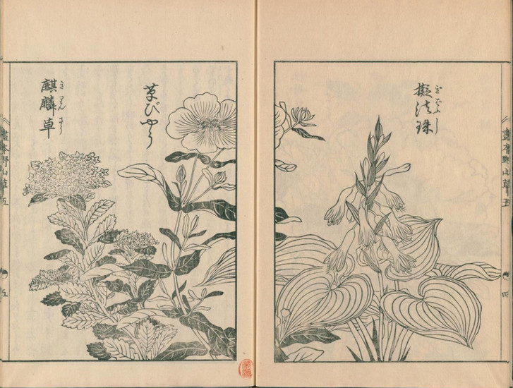 庭を持てない庶民の間でも、花見が盛んに行われ、早春のウメから秋の紅葉まで、江戸近郊には四季それぞれの名所があり、ガイドブックまで出版されていました 。当時の庶民層にまで浸透した園芸熱の高まりは、世界的にも類を見ないレベルであったとされています。このような熱狂の中で、花を鑑賞し、その優劣を競う「花合せ」が盛んに行われました。優れた品種には「番付」が付けられ、その記録は「銘鑑」と呼ばれる登録簿に記されました。キクは1713年頃から京都で花合せが始まり、数年後には江戸でも行われました。サクラソウは1804年に江戸で新花の品評会が催され、アサガオは大阪の商人が鉢植えを速荷で江戸まで運んだ記録が残るほど盛んでした。これらの「花合せ」や「銘鑑」といった制度は、単なる趣味の範疇を超え、品種改良を促進し、植物の価値を共有・固定化する一種の「文化産業」として機能していたことを示唆しています。これは、現代の品種登録制度や品評会の原型とも言えるでしょう。『繪本野山草』は、このような江戸時代の豊かな園芸文化、特に日本独自の繊細な美意識を反映し、その普及に大きく貢献した作品なのです。