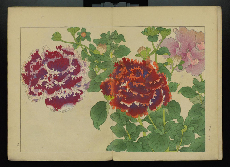 大正時代には、西洋の植物が家庭で栽培されるほど普及し 、着物などの日常品に洋花模様が取り入れられるようになりました。これは、西洋の花卉が一部の特権階級の鑑賞物から、一般庶民の生活文化の一部へと変化していったことを示しています。『西洋草花図譜』や『象形花卉帖』のような出版物は、この「美意識の民主化」を加速させる役割を果たしました。高価な生花や海外の植物園に直接触れる機会が限られていた時代において、精緻な木版画で描かれた西洋の花々や、伝統的な牡丹は、多くの人々が手軽に西洋の美や日本の伝統美に触れることができる教材であり鑑賞物でした。これにより、西洋の美意識や園芸文化が、知識層だけでなく、より広い層に浸透し、日本の生活様式やデザインに影響を与えていきました。これは、単なる流行の追随ではなく、新しい美の価値観が社会全体に広がり、人々の日常生活を豊かにしていった過程を示唆しています。